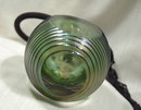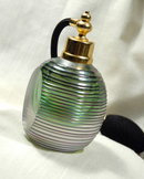 The color of this hand blown crystal glass perfume bottle is incredible. It is basically green however it's iridescence that shimmers like oil giving off a rainbow of colors. The fat flask shape of fine horizontal ribs with a cut polished flat oval surface on the front and back. It is quite heavy the glass is solid to the compartment that hold the perfume. The compartment that actually holds the perfume is visible through the ovals.