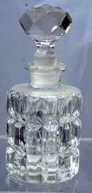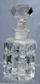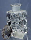 Czechoslovakia Crystal Glass Perfume Bottle with Stopper. It is beautiful crystal clear with a cut in beveled rectangle pattern. The stopper has a faceted round cut. There are a few minute chips on some of the points. It it etched on the bottom "Made in Czechoslovakia". It is surprisingly heavy for its size.