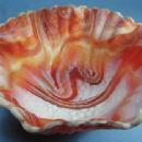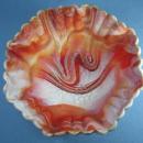 Totally awesome slag glass bowl in a yummy tangerine color.. it is not red. Fluted sides and scalloped rim with a grape and vine mold make this a very stunning console bowl. It measures 10 inches diameter x 3 1/2 inch high. The condition is excellent with no chips, cracks or hairlines. Marked/signed on the bottom.