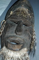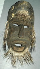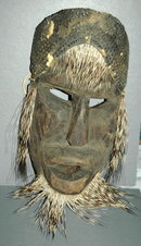 Antique Hand Carved Mexican Wooden Mask with Porcupine Quills and a Reptile Skin head dress. I think it is iguana skin. It measures 10" x 6". This measurement does not include the quill that make up his beard. The color is much darker that what my pictures show. I am not sure what area it is from it is quite rustic. At first I thought is was African due the full lips. The Mayan's have this feature as well. After doing some research I found some similar mask with quills attached in the same manner that were claimed to be Mexican. Perhaps it is from the Yucatan Peninsula. I found the mask at an estate sale that was loaded with ethnic artifacts from all over the world.