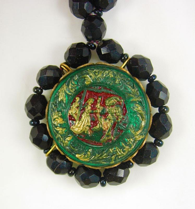 This is such an interesting vintage piece with its faceted black glass beads and the center glass pendant with what looks like Sir Lancelot and Guinevere with their renaissance clothes and hats. The photos aren't that clear but you can see the center piece is layered czech glass and it has deep reds and greens and hints of golden yellows.. This measures up to 18" long around the neck and the drop is an additional 2" long. The setting is filigree that raises up to encompass the center piece. The back of the pendant shows the rich detail in this old setting. It is in great shape.