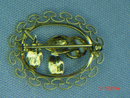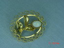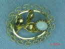 Beautiful 14K G.F. oval pin with a curvy pattern on the outside. The center has an opal flower with three gold leaves. It is in excellent condition.