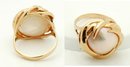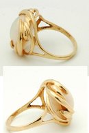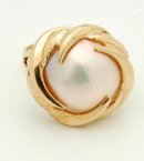 14K Yellow Gold Ring with Mabe Pearl. The size is 4.5. The lustrous large 15 mm white pearl radiates a rainbow of colors. The head of the ring measures roughly 5/8" in diameter with the setting wrapped over the white Mobe pearl. Gram Weight: 4.3. It not stamped but it tests positive as 14K. However there is a stamp of a P in a circle.