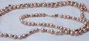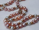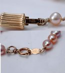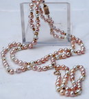 Lovely Baroque Pearls & 14K Gold beads in this Demi Parure set. The pearls are white and pink and are approximately 5mm each. The necklace is 23.25" long. The bracelet is 8". The necklace has an interesting clasp but bracelet has a different clasp. The condition is very good. Some of the gold beads have dents.