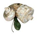Our client's powder flask (barutdan) of the Mughal Empire period, circa 17th-18th century, likely from Gujarat, is well crafted from a nautilus shell with mother-of-pearl applied in an arcaded design with rosette motif on the top with metal loop and later fabric pouch attached. Finial missing and wear consistent with age.
