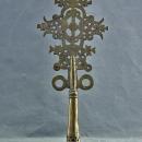 The cross is made of cast copper alloy (white bronze) and has been pierced and engraved in openwork with an intricate pattern of interwoven lines, topped with small crosses. Two circular decorations flank the bottom of the cross; this motif refers to the divine halo of Christ. The cross is mounted on a tapering conical socket decorated with a pierced zigzag pattern.