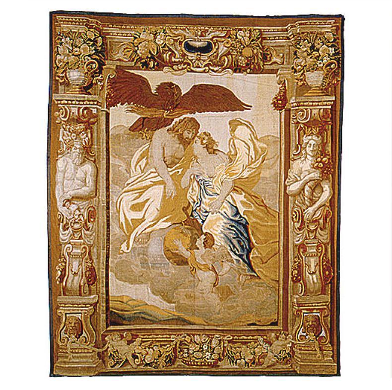It depicts Zeus and Hera among clouds surmounted by an eagle holding thunderbolt, with the angel, Eros, lifting a globe below, framed in the Geubels characteristic style with floral and foliate architectural borders composed of garland and cherubs, with a caryatid holding a cornucopia on the right, and a satyr in the shape of Dionysus pouring wine from an ewer on the left.
