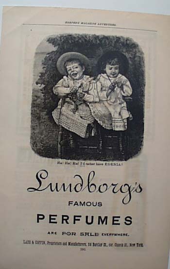 1891 Lundborgs Perfume ad, 2 little girls say Ha Ha I'd rather have Edenia, Lundborgs perfumes for sale everywhere, Ladd & Coffin, Church st. New York. Vintage ad that appeared in Harpers mag, 1891 , 6 1/2 x 9 1/2"