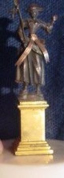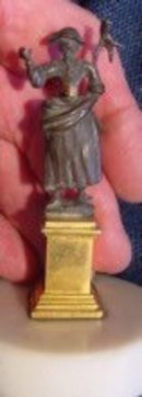 A charming little table ornament of a bronze shepherdess with her beribboned hoe on a fire-gilt stand, which is in turn mounted on a white marble circular base, a Romantic emblem of the bucolic life. It is all original, the little figure even retaining her gold-metal sash, and dates from around 1775, French or Continental. On her base, she stands a little over three inches tall, the marble being about 5/8 inch thick.