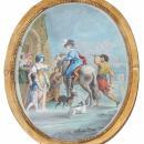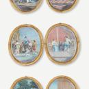 They depict scenes from Gothic era castle and its surroundings, including a prince being entertained by harpsicourd and lute player, courting lovers in the countryside, subjects bowing to a prince, female on horseback being handed a goblet with would-be assassin behind her, cavalier greeting two females, and a couple dancing in a courtyard.
