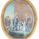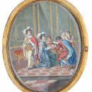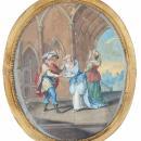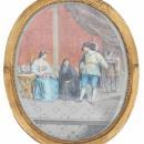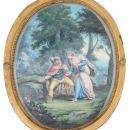 Our collection of size figurative watercolors dating from the eighteenth century reside in glazed period giltwood frames measuring 11.5 by 14.25 inches. All apparently unsigned, and not examined outside their respective frames.