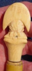 A momento of the French Revolution is this ivory figure of an "incroyable," a dandy of the Terror. In all likelihood a parasol handle, the figure sports the outrageously high muffled cravat and collar of the day and the exaggerated "tricorne" hat with its ribbon and revolutionary cockade. It is in fine condition with only the end of his nose missing, and is mounted up on a Siena marble base. French, circa 1795. Approximately three inches tall (4-1/2 inches including the base) and 1-5/8 inches wide by 7/8 inch deep.
