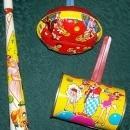 Set of 3 1950's vintage noisemakers, made by the U.S. Metal Toy Manufacturing Company. Brightly lithographed tin, featuring party goers & clowns. Set consists of 9"l horn; 3.25"d closed bell; 3.25"can. Overall in very good condition: may have slight defects and minor rust spots. Please email for further details if necessary. Sold as a set, as is. Inglenook Antiques...Established 1989.
