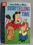 1959 Dell Marge's Lulu and Alvin Giant comic. No 1 edition, Story Telling Time by Marjorie Henderson Buell. Excellent condition. This has the upper right corner torn & blue ink on bottom, these were done to show the book didn't sell & they would mark the books this way. There is one rip on a page about 1" long from closing the book with the corner bent up, and the covers have minor creases, otherwise near mint condition. The color is wonderful & it doesn't appear to have been read much if at all. 10 1/4 x 7", aprox 60 pages (I just guessed)