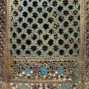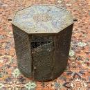 Our client's beautiful antique Kashmiri or Indo-Persian octogonal shape brass table is finely crafted of openwork panels of arabesque and geometric motifs, inlaid with turquoise and violet enamels, with handles and working door with clasp. In good condition with bends, small losses, and scattered enamel losses to the top and sides.