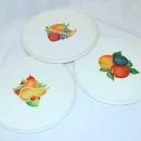 3 Painted Wood Trivets with Fruit Decouge Decorations Old country kitchen . They measure just a bit under 9". There is some lettering on the back of one of them that is faded so much that I cannot read it. The condition is good but there are some chips on some of fruit on two of them . And overall signs of age on the white paint all all. The fruit is a transfere and not hand painted. But still reatlly cute.