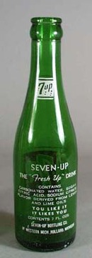 7 up bottle 1950s era. This is the green glass 7 ounce bottle that has the girl with the bubbles pointing upward, see some of our advertisments showing the girl for more info on date of bottle. This one was bottled by Seven-up Bottling of Western Michigan, Holland Michigan, Duraglass bottle, 1952, 8 x 2 inches