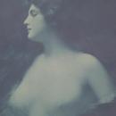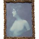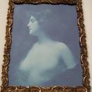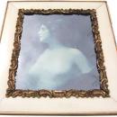 This is believed to be an original silver gelatin print or photogravure after the French artist, Angelo Asti (1807-1903), depicting Erbluth, one of his more popular subjects. It resides under glass in an unusual period frame featuring raised, scrolling decoration in brass or bronze. Frame measures 23" by 28.5" and the exposed portrait measures 17" by 22". We have not examined the print out of the frame. There are some obvious losses to the giltwood edges of the frame and surface dirt. Quality of the image overall is extraordinary, but there is some crackling throughout the lower 1/4 or so of the image, and chips from the surface on the lower right side. Exported from Budapest, circa 2000. Underside carries the stamped mark of the Hungarian National Gallery (Magyar Nemzeti Galeria), indicating the piece was authenticated and approved for export. Also visible under a later layer of kraft paper is the stamp of the Képcsarnok (Hall of Paintings) in Budapest. Founded in 1948, Kepcsarnok was the firm dealing in contemporary fine and applied art during the socialist era.