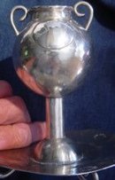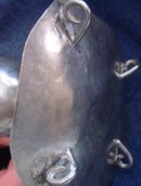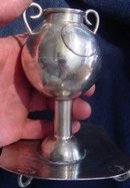 An almost Picasso-like creation, this standing cup in heavy mine silver for sipping mate features an attached dished base raised up on four coiled feet that echo the “ears” of the cup. The only surface designs are a double row of ratcheted circles and four punched-in quatrefoils, all on the base. This eccentric little figure is Bolivian, late 18th Century, and measures approximately four inches by 4-3/4 inches at the base and 5-1/4 inches tall.