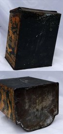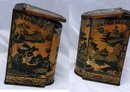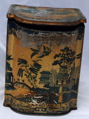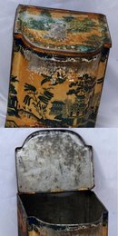 Antique Chinese Tea Tin. It has a hinged lid and decorated with Chines scenes of landscapes and pagodas. The condition is well worn. There are scratches and scrapes here and there. Most of the decoration is intact. The lid has a main issue. The surface is gewy. When I tried to gently clean it off the decoration or lithography came up as well. So I suspect that someone tried using an inappropriate cleanser on one time which picked up the paint too. Or it could be that very old kitchen grease is actually toxic enough to bind with the painted surface. Anyway I don't know what to do about the lid. It cannot be cleaned without removing the rest of the decoration however it doesn't look so good left as it either. The new owner can decide.