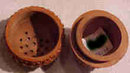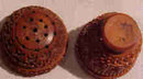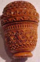 This urn-shaped coquilla nut pounce pot combines fine turning with delicate designs formed by small machine-turned repetitions of varying sorts to produce rosettes, festoons, etc. with a dramatic effect. Possibly English or Continental, maybe scrimshaw of Napoleonic prison-of-war art, it is hard to pinpoint exactly where it was made, but wherever, it was certainly well thought out. Early Nineteenth Century. Mint condition. Approximately 2-5/8 inches high and 1-3/4 inches in diameter.