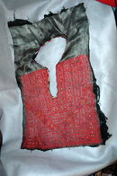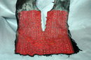 It measures a total of 13" x 14". It probably was at one time sewn into a shirt. The design is sewn onto a dark gray smooth satin fabric that could be thick silk. The back of the fabric is black. As you can see the stitches are red but here are some other colors such as blue, yellow, white and some green. It does remind me of a folk art design. There is a hem partially around to keep it from unraveling. All of it is completely hand stitched. The conditions is very good for age. it is being sold as it. Some of the satin edges are unraveled a bit but this no no way effect the needle point embroidery work.
