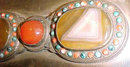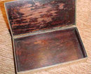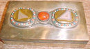 This cigarette box was ordered in the Thirties by a famous Hollywood director; he provided the antique jeweled Tibetan belt buckle to a Hong Kong jeweler to be mounted up in a manner suitable to the piece. The copper box was plated in nickel which very closely matches the tone of the low-grade silver surrounding the agate, carnelian, turquoise and coral antique creation. The buckle is beautifully enhanced by its setting, but is free-standing and can be removed if so desired. The box is lined in dark rosewood and measures approximately 3-3/4 inches by 6-7/8 inches by 2-1/4 inches high. (A second cigarette box of a similar nature and the same provenance is offered at Trocadero #13691.) Excellent condition.