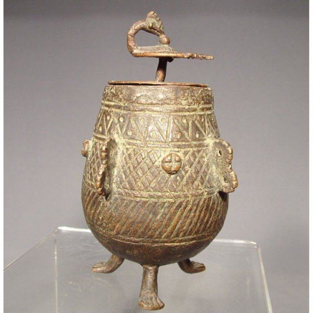 Or Best OfferThis is an exquisite antique cosmetic jar that dates back to the 19th century and originates from the Bengali region of India. The jar is designed in the shape of a barrel, with a rounded body and three plain legs to support the bowl. The jar is made of bronze, a material commonly used in ancient Indian art and craftsmanship. The jar's cover is adorned with a beautifully crafted peacock finial that adds an extra touch of elegance to the piece. This antique cosmetic jar is not only a stunning work of art but also a unique piece of history that showcases the artistic and cultural heritage of ancient India.