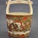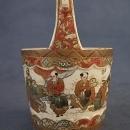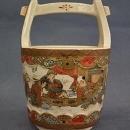 Antique 19th century Meiji period miniature Japanese Satsuma vase in the form of a small handled water bucket Teoke. The exterior is finely hand painted with a group of 10 samurais, dressed in elaborated brocade kimonos, highlighted with gold. A raised border adorned with intricate geometric designs, in raised enamel and gold.