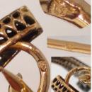 This originated from Paris and was passed on to a family who eventually moved to NY. 3 or 4 generations back, with no heirs, this was sold at auction and we were fortunate enough to purchase it. THis is 18kt or 22kt higher ROSE gold with 7 ( lucky 7) genuine diamonds set in white gold or platinum stars. There are a few French hallmarks on it and the one I could make out the best is a horse's head with what looks like an hour glass with a flat bottom and top. ( see photo) The hallmark depicted here ( the horse head) is a French hallmark that was struck in gold jewelry. It was used between 1838 and 1919.Before 1910, French platinum jewelry may have a maker's mark, but it was not hallmarked, which is why I think the white metal maybe platinum. As you can see from the exquisite cagework sides, this was a high quality piece. I found a pretty link 24" gold filled chain ( included in this sale) that the brooch fit nicely on. This can give you an idea of the different ways you can use such a wonderful antique piece. The 7 diamonds are crudely cut which makes me believe they were hand cut or on a machine that didn't use electricity. Possibly rose or diamond cut. All the diamonds were tested and are genuine. They measure about 2 cm's across and are flat on top ( on some). Assayed French gold is never lower than 18k which is why I know this is 18 or 22kt. IT is in fine condition and as I said, I am including the chain so you can wear it more than one way.