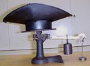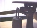 This is an 19th century cast iron beam weight scale, sometimes refered to as a fish tail scale as the shape of the base looks a bit like a fish tail on one side with the two curved legs, under the slide scale. The scale is complete except for the slotted weights that would set on the very end hanging lead cover that you see in the pictures. The scale is graduated and reads 0, 1/2, 1, 1/2, and is slotted at the top for the slide scale to indicate the difference in the weight amount that would normally be shown on the slotted weights that are missing. The scale is in working condition, but without the missing weights, can't be used to weigh as is. It comes with a tin footed, scale basket that sits on top of the cast iron table at the top of the scale. The basket is 4.5" high x 8.6" wide, and is 14" long overall. The footed area is 5.37" diameter. The basket is in very good shape, no rust, painted black. The scale is 6.6" tall, the base is 6" x 4.75", and the overall width is 13", without the basket on top. The scale has a little pitting on the top plate diameter, no paint intact, but is not rusty, cracked, or otherwise damaged. With a set of slotted weight, this scale is valued at about $225, plus about $50 for the basket. Since the set of weights is missing the price was adjusted accordingly. A nice clean scale overall!