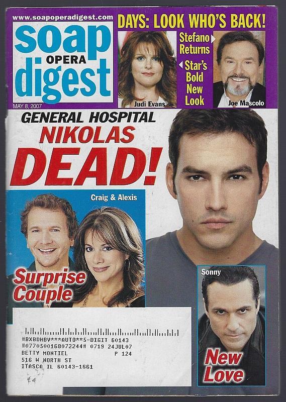Soap Opera Digest Magazine May 8, 2007. General Hospital Nikolas Dead on the Cover. Articles inside include Sebastian Roche, Bonnie Dennison, and more. Filled with Photographs of your favorite Soap stars and vintage advertising. Magazine is in good condition, wear at edges, a few pages are folded