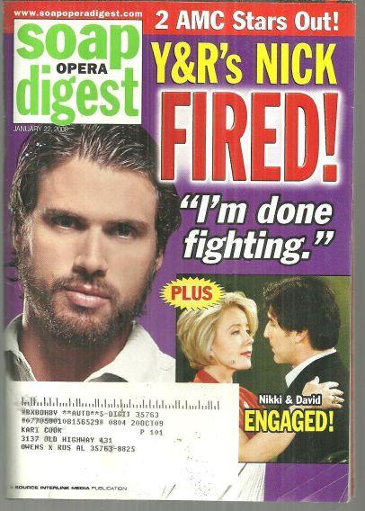 Soap Opera Digest January 22, 2006. Y & R's Nick Fired on the Cover. Articles inside include Nick is Fired and Niki Marries David, Couple Corner, Daniel Cosgrove, Marnie Schulenburg, and more. Filled with Photographs of your favorite Soap stars and vintage advertising. Magazine is complete and in good condition, slight wear at edges, puzzle has been done.