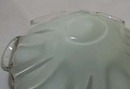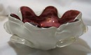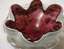 Art Glass Bowl Ground Bottom. This is an unmarked, art glass bowl. It has the clear glass around the sides and bottom. Then a layer of white glass and inside that it is burgundy glass. The burgundy has darker spots that glitter. It has a scalloped edge. Along one edge the burgundy color has an air bubble that has popped. Otherwise in excellent condition. Measures approx 7" across the top. Sits approx. 3" high. My guess is this is from the 1950's.