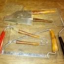 5 Pieces American Depression to Early Retro era kitchen tool food preparation utensils. Two bakelite cake breaker cutters, meat bone saw, pinch style pie piece caddy dessert carrier tool & hot dog frank stabber spring type fork.
