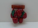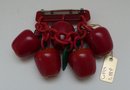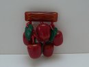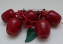 Delightful Vintage Bakelite Apples with celluloid green leaves and a celluloid chain in excellent condition with no cracks or chips. Whimsical and colorful and special. It measures 3" long and about 3 1/4" wide. A great Classic!!!