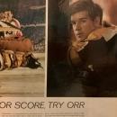 Bobby Orr Boston Bruins 1970 Article. This 3 page color February 27, 1970 Article states to save or score, try Orr. Pictures by John Zimmerman shows Bobby Orr from Parry Sound, Ontario Helping Goalie and Setting out Penalty. Also shows him in fight with Toronto's Pat Quinn. Also shows Orr and Chicagos Bobby Hull on Ice. Magazine tear sheet picture is taken through plastic and may show wrinkles or crookedness that is not in the ad. This original magazine tear sheet measures 10 1/4 inches wide by 13 1/4 inches tall.