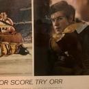 Bobby Orr Boston Bruins 1970 Article. This 3 page color February 27, 1970 Article states to save or score, try Orr. Pictures by John Zimmerman shows Bobby Orr from Parry Sound, Ontario Helping Goalie and Setting out Penalty. Also shows him in fight with Toronto's Pat Quinn. Also shows Orr and Chicagos Bobby Hull on Ice. Magazine tear sheet picture is taken through plastic and may show wrinkles or crookedness that is not in the ad. This original magazine tear sheet measures 10 inches wide by 13 1/4 inches tall.