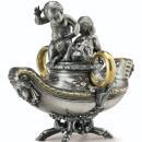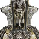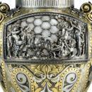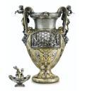 This double walled vase has an amphora form, with body and foot with silver, gilt and patinated and stylized flowers, athemions and sprays of cherries against an etched and matted ground pierced to reveal a gilt inner wall. The upper body is detachable via a slip-lock, and mounted on both sides with arched panels formed of hexagonal beveled glass tiles. One glass panel applied with bacchic infants taunting a rearing goat and the other side with infants feeding grapes to a lioness under a looming bust of a satyr. The patinated and gilt upswung loop bifurcated handles are mounted with fully modeled figures of Pan bearing a syrinx and thyrsus and a draped maenad playing two flutes, both above roaring lion heads, the rim inset with a slip-lock detachable gilt bowl etched with masks of various representations of Bacchus spaced by ribbons and trophies and with scrolling fruiting vines. The base of interior with detachable base metal drip pan to accommodate the removable oil lamp designed to illuminate the glass tiles from within. The lamp is raised on four hoof feet, the upturned ends cast underneath with masks and with detachable cover mounted with two infant satyrs and flanked by gilt loop handles.