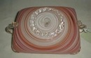 Bowl, Orange/Red/White Swirl Striped. This is a wonderful bowl with a striped swirl pattern in orange, red and white. It has applied handles and the handles have gold flakes in them. Has a pontil mark on the bottom, see photo. It is in mint condition, 2"h x 9" from handle to handle.