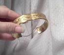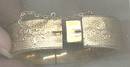 A great hinged bangle either gold filled or gold topped. It is marked, but is so very worn that I can not make out just what it is. It looks something like: Kooll & ohe under the ooll part and an J. The ooll and the ohe use the same "K". It has it's saftey chain and it may be the original because of the coloring, it looks the same as the bracelet and the rings it is attached to. The bracelet is hollow. It has a beautiful embossed, textured and floral with foliate decoration around the outside. It is a lovely bracelet. The clasp is in good working condition. It is approx. 5/8" wide and is approx. 7" around the inside. The fees quoted for shipping are for priority/NO insurance in USA.