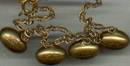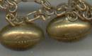 Gilt Brass Football Charm Bracelete:What a nice bracelete for that football fan in your life! The chain appears to deffinately be gilt brass. We believe the footballs were as well. There is wear to the surface of the footballs. It is missing one of it's footballs. The extra bit of chain would be nice to add your own charm to with something special to yourself. Aprox. 7" long/ 9/16"x3/8". The shipping fees quoted are for first class/No insurance in USA.