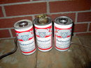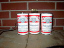Anheuser Busch Budweiser Lager Beer can light fixture lamps & tabletop cigarette lighter. Albuquerque New Mexico IMS CORPORATION mark on one can lamp. Sockets & switch work, JAPAN made lighter insert in good condition.