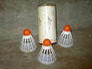 England made Carlton Brand lawn game shuttlecocks in original Sportcraft Bergenfield New Jersey cardboard tube can with metal end caps.