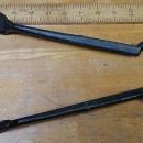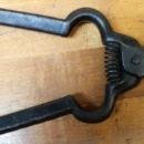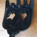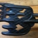 Offering this vintage pair of cast iron tongs measuring 13 inches long; spring hinged handle, fork area is a solid base with 5 small prong tines on each; decorative arrow and drape pattern on back of prong base. As shown in the photo, one prong or finger is cracked off. Otherwise in very good condition, very clean, no cracks or rust. Circa late 1800's to mid 1900's. Black finish. No makers marks. A handsome pair for your use or your display collection!