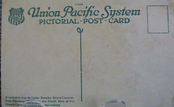 Castle Peak & Angels Landing UP RR PC This is a nice color post card, with white border. Transportation category. On the bottom front it reads, Castle Peak and Angels Landing, Zion National Park, reached from Lund, Utah on the Union Pacific System. On the back it reads Union Pacific System, Pictorial Post Card. A summer trip to Cedar Breaks, Bryuce Canyon, Zion National Park and the North Rim of the Grand Canyon makes an ideal outing. Has the Union Pacific System shield on the back. Never used. 20th century card. Has one small tear, about 1/4"" on the front. Otherwise in good condition. 44 cents shipping if in USA 3 1/2 by 5 1/2""
