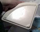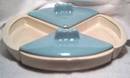 Here is a lovely example of 1950's California pottery. It is a set of lazy susan dishes, two of them with lids. The triangular dishes are off white with tiny brown specks. The lids are that wonderful 1950's aqua. The makers mark was incised into the dish when clay was soft and the glaze filled it in and makes it hard to read. I think it says something like "____ West 125 Calif". The entire set is approx. 12" across. Each dish is approx. 8"X5 5/8". The shipping fees quoted are for priority/Insured in USA only. The cost to send it from easty coast to west coast is $18.35. I will refigure postage if you purchase it and live closer. The set weighs approx. 4 to 5 pounds.