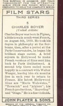 Charles Boyer Film Star Tinted Card 1938, Third series #5 , Studio signed (artists signs original & then they print signature on card or photo) features Born in 1899 in France. Was with United Artists Studio. His contract gave him 6 months free each year to return to France. Made such films as Marie Walewaka and Algiers, He was also a fine violinist. by the John Player & sons company branch of the Great Britain & Ireland Ltd, Mint condition This cigarette card is 1 1/2 x 2 1/2" Please note photo is larger than actual card. Very nice series of movie Star cards are being offered. Please check our other auctions for listings. Postage in the USA will be 34 cents & other countries will be aprox 1.00 you pay only actual postage, no more than 5.00 if you want global priority.