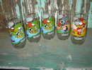Set Five Peanuts Camp Snoopy cartoon glass tumblers in three different scenes. McDonalds Fast Food promotional cups dated 1983. Light fading on Linus glass.