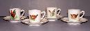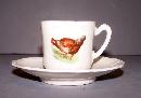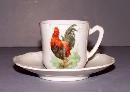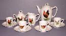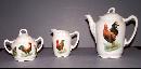 This is a beautiful child’s tea set. There are 11 pieces to this set, one pitcher, one creamer, one sugar and four cups and saucers. There is a handle on one of the cups that has been broken off and re-glued and has a small chip. There is also another cup that has a small chip at the top. The pitcher is 5 1/2 inches tall, 6 inches from the spout to the handle. The cups are 2 inches tall and 2 inches in diameter. They each have a picture of a rooster or hen except for the saucers. This china set would make a lovely addition to your home.